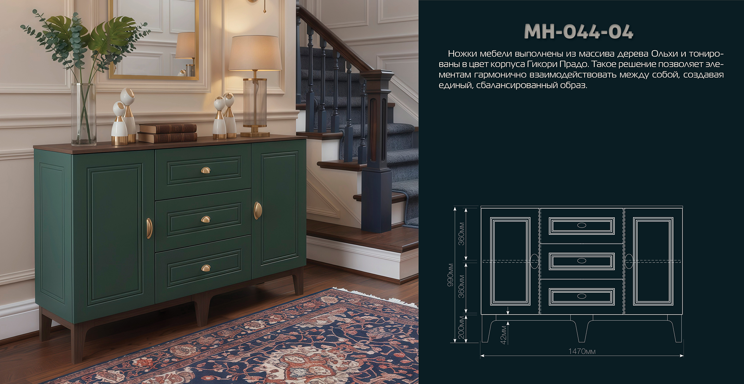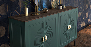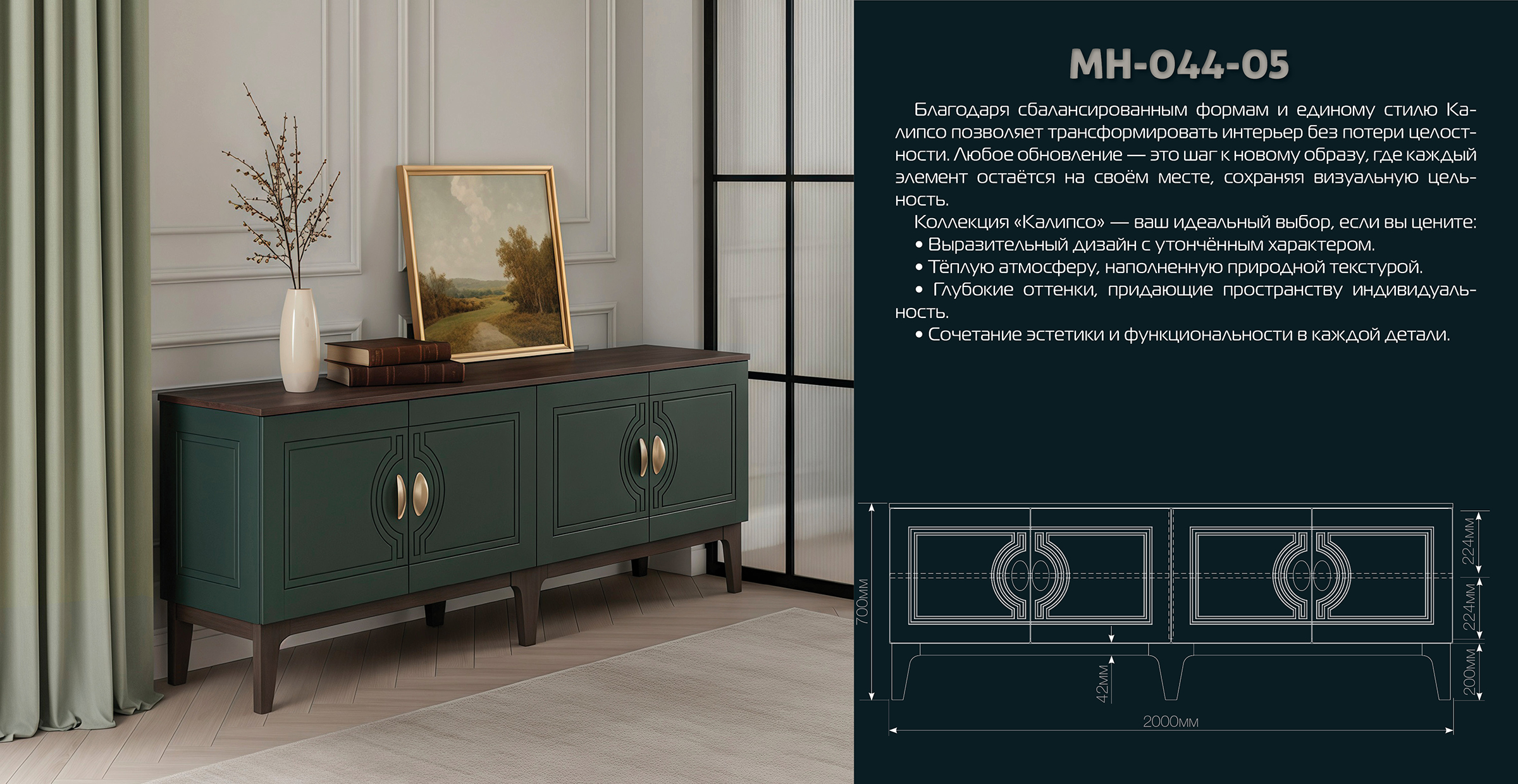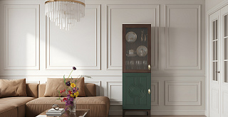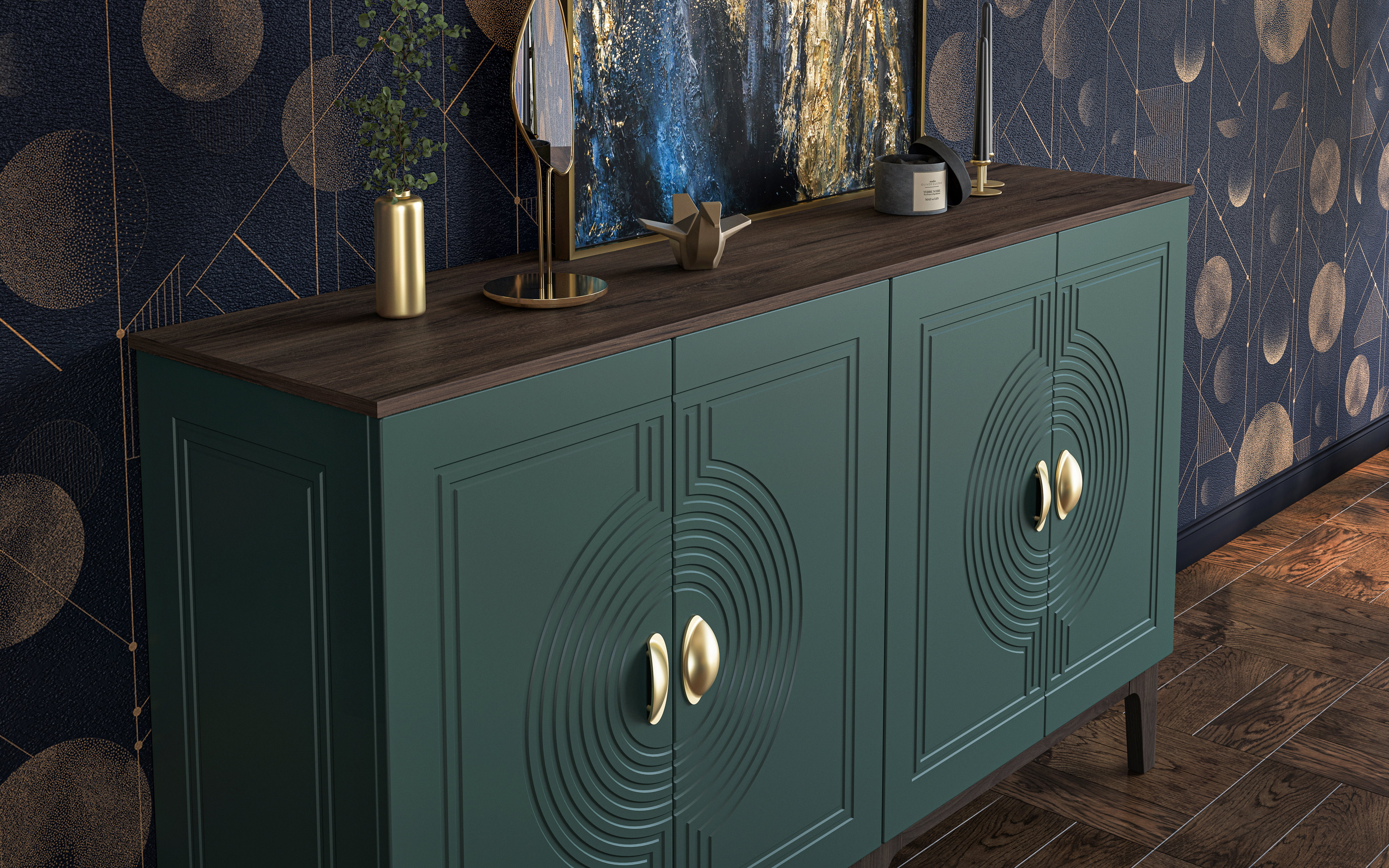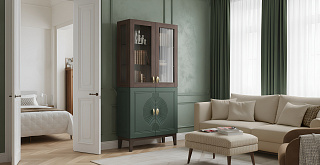 Сочетание насыщенного корпуса Гикори Прадо и акцентного фасада Комбу Грин формирует образ, в котором выразительность встречается с утончённостью. Тёплая древесная текстура наполняет интерьер уютом, а глубокий зелёный фасад придаёт пространству характер и индивидуальность.