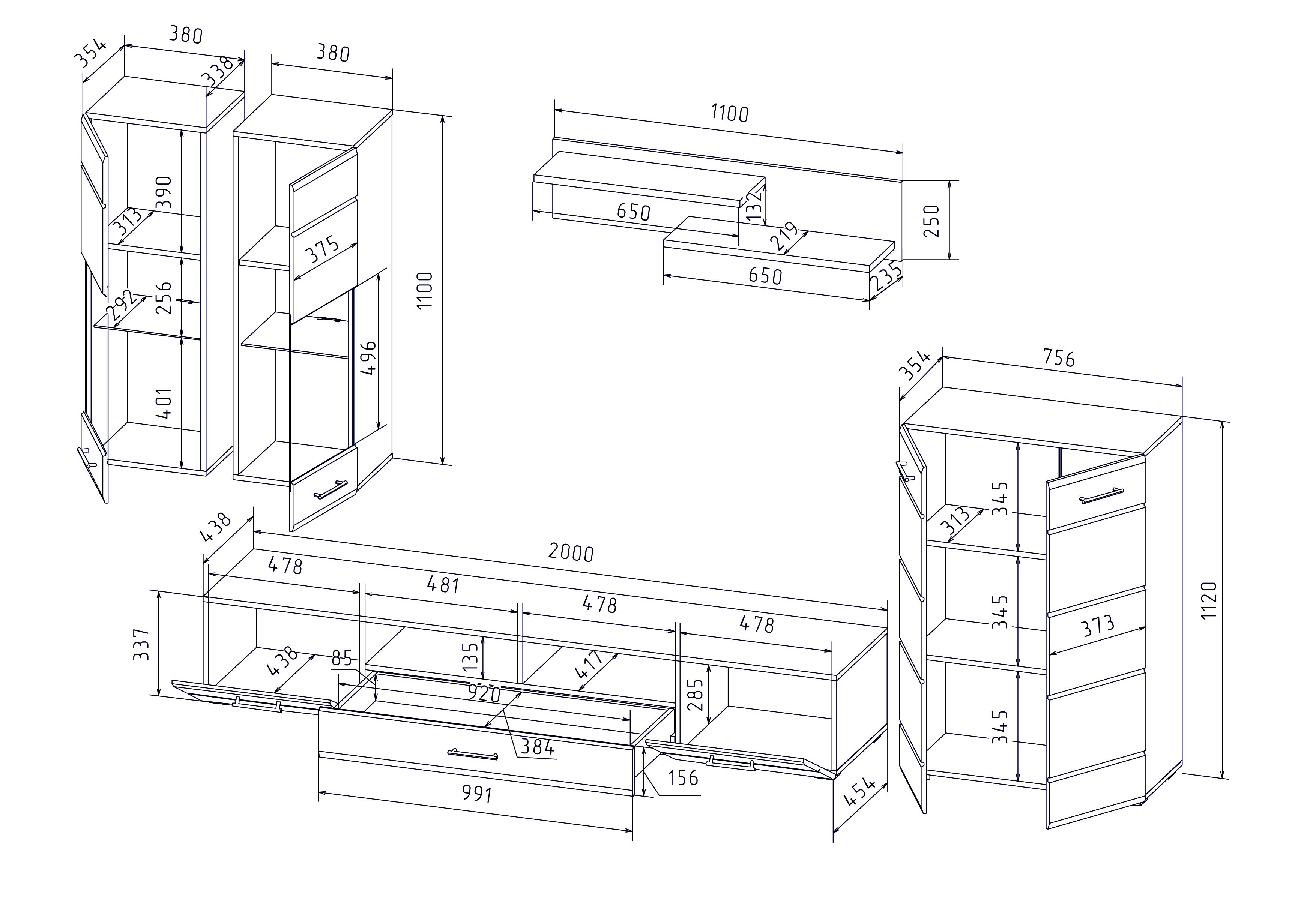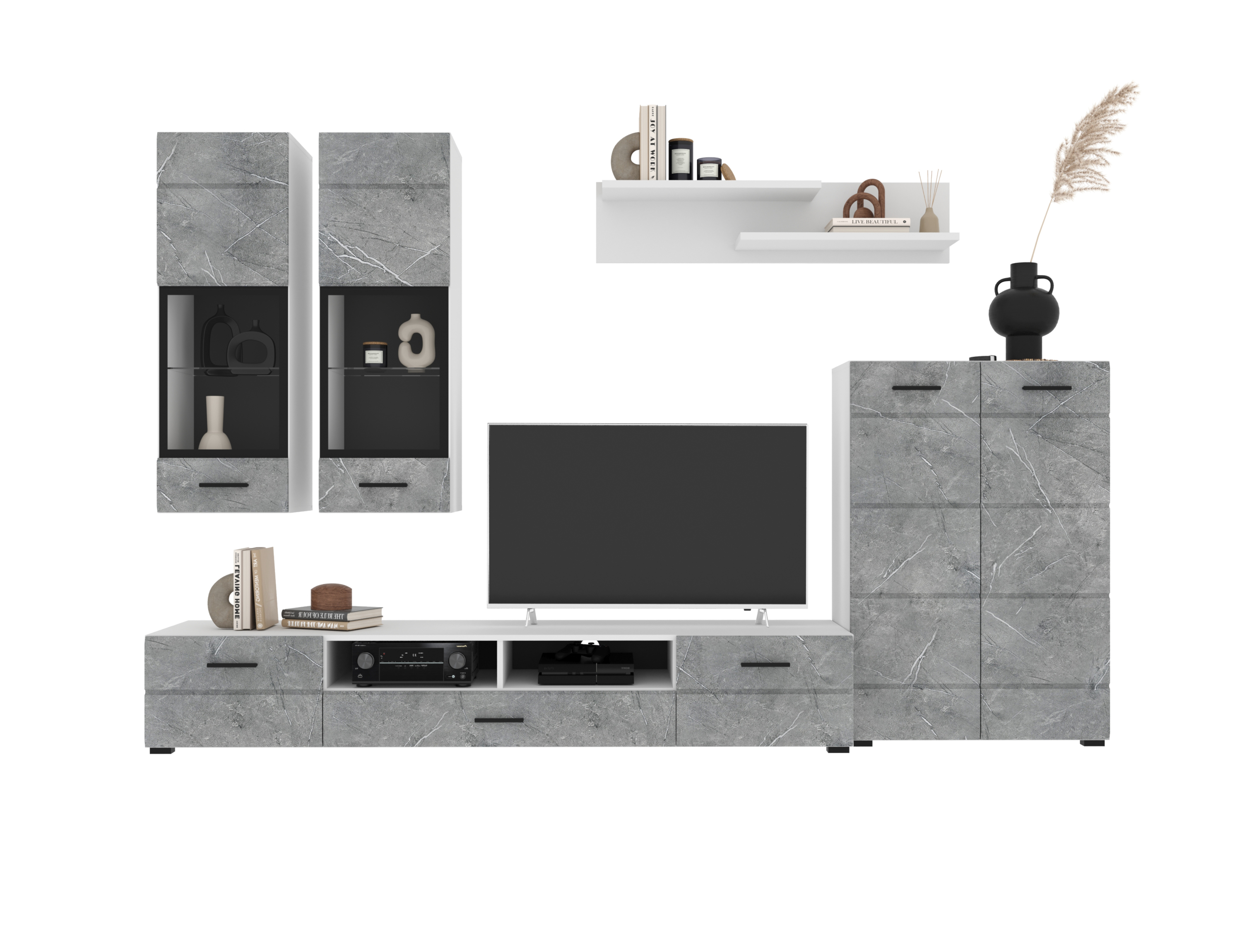 В комплект входят 5 модулей: тумба ТВ, напольный шкаф, полка, 2 навесных шкафа со стеклом.