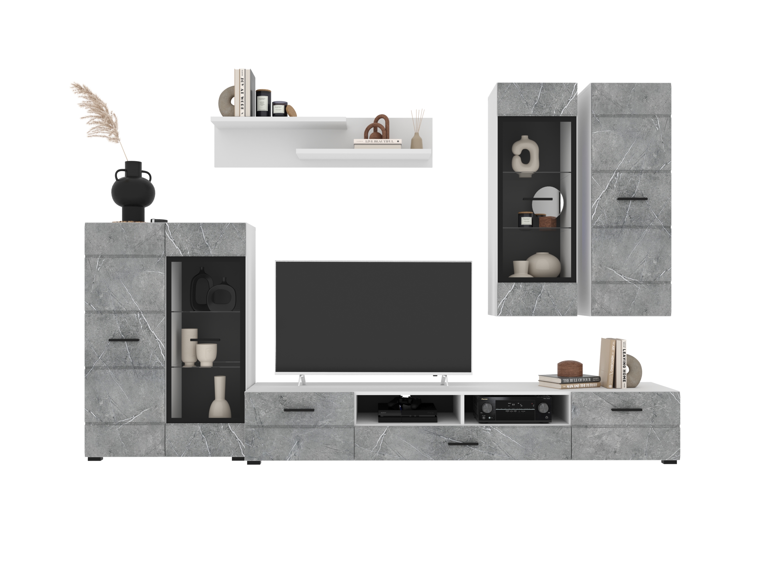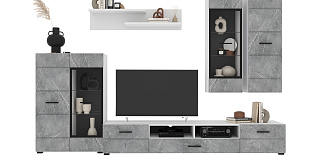 В комплект входят 5 модулей: тумба ТВ, напольный шкаф комбинированный со стеклом, полка, навесной шкаф со стеклом, навесной шкаф.