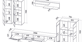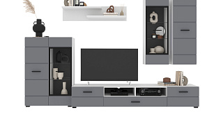 В комплект входят 5 модулей: тумба ТВ, напольный шкаф комбинированный со стеклом, полка, навесной шкаф со стеклом, навесной шкаф.
