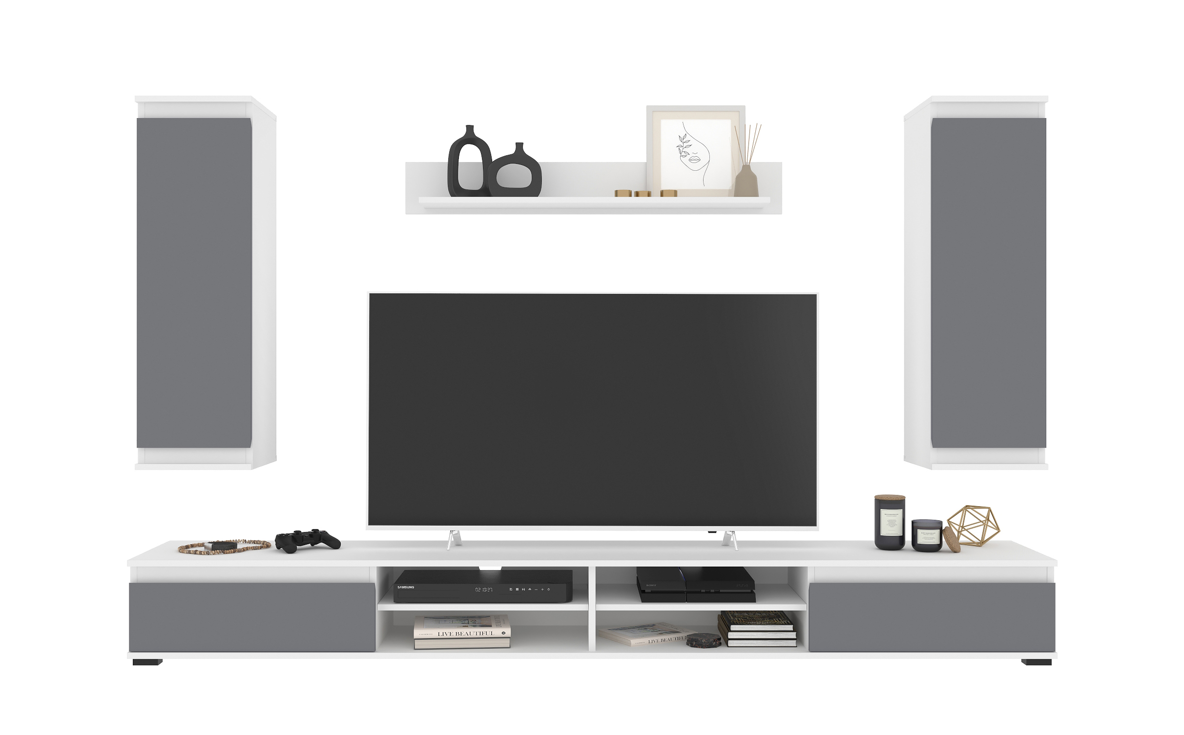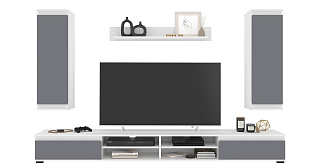 В набор входит 4 модуля: тумба ТВ, полка, 2 навесных шкафа.