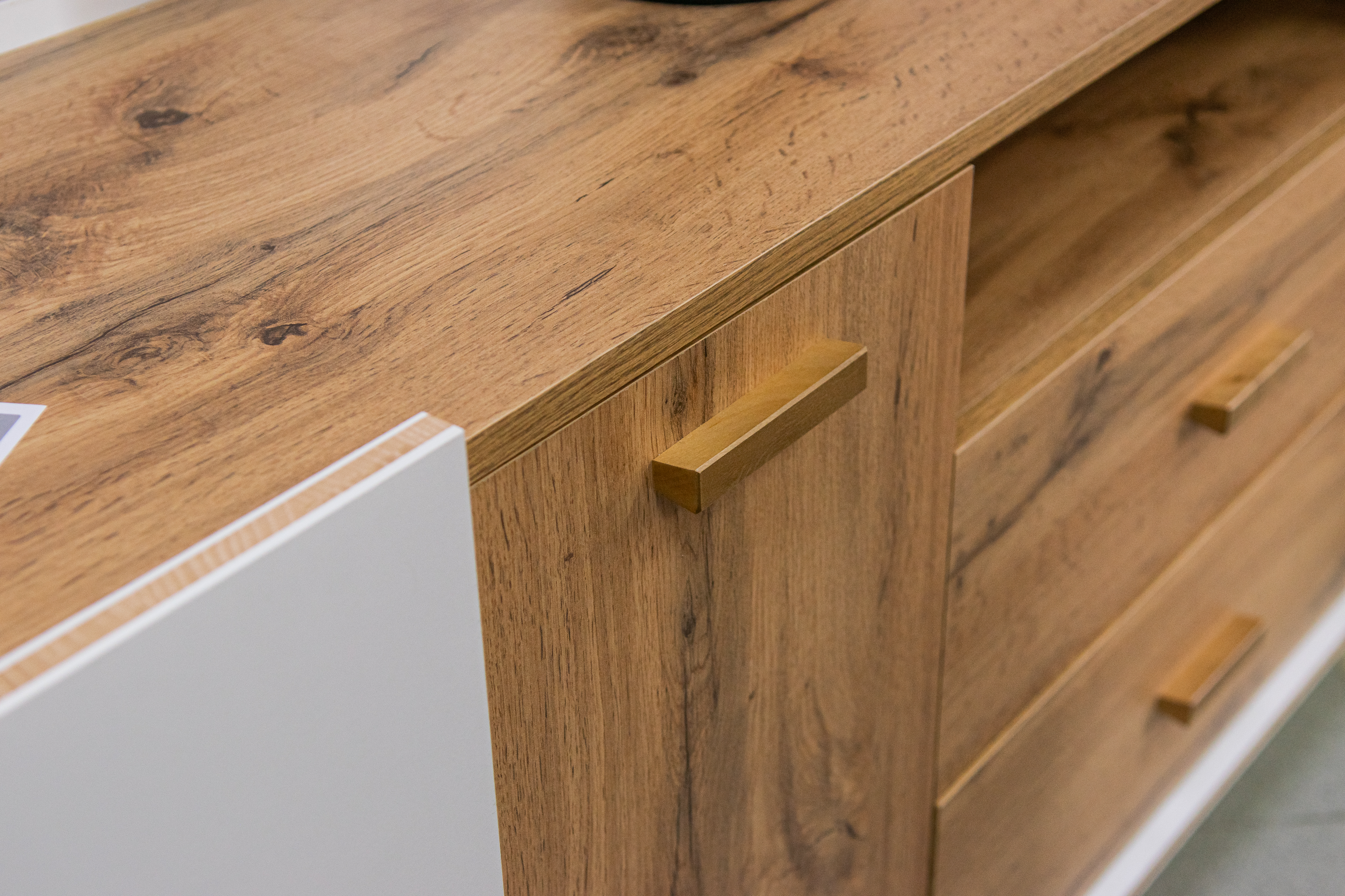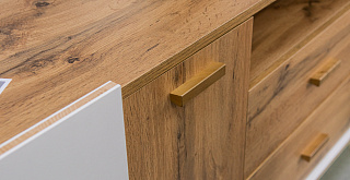 Коллекция «Сканди» изготовлена из комбинации высококачественных ламинированных плит белого цвета и цвета дуба вотан. Деревянные ножки и ручки добавляют мебели натуральности и тепла, а строгие формы делают её универсальной для любого помещения – будь то гостиная, кабинет или даже кухня.