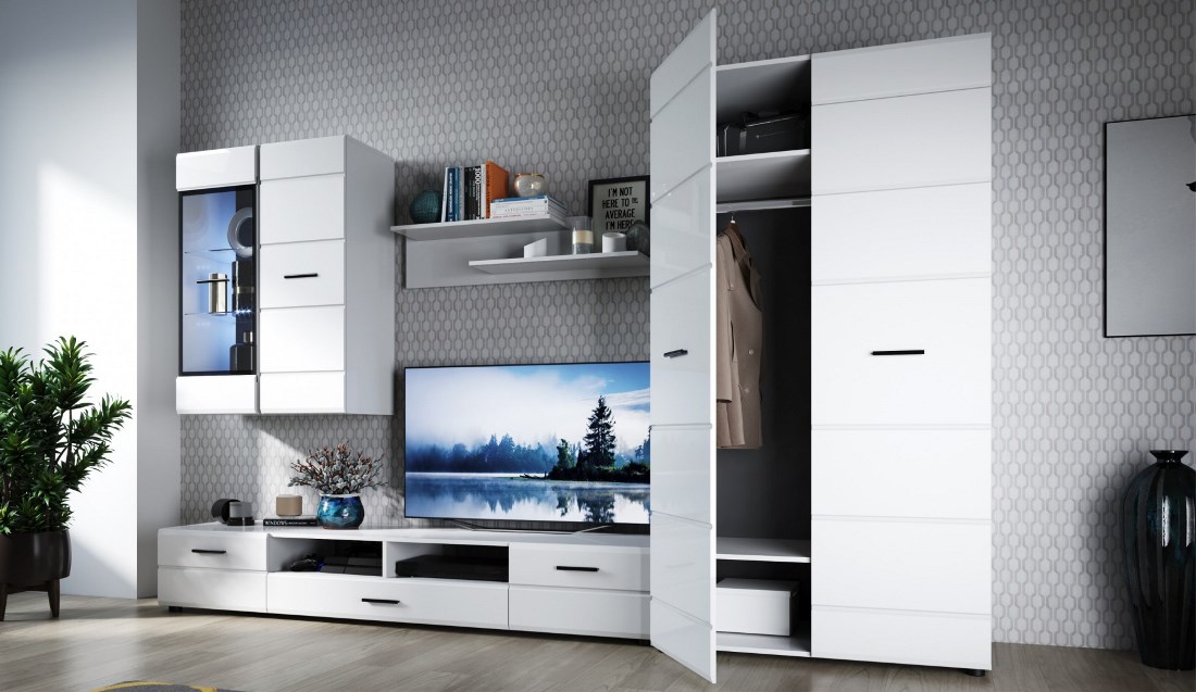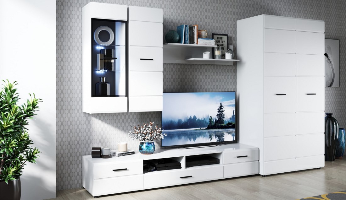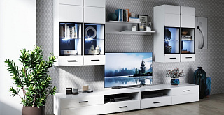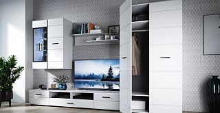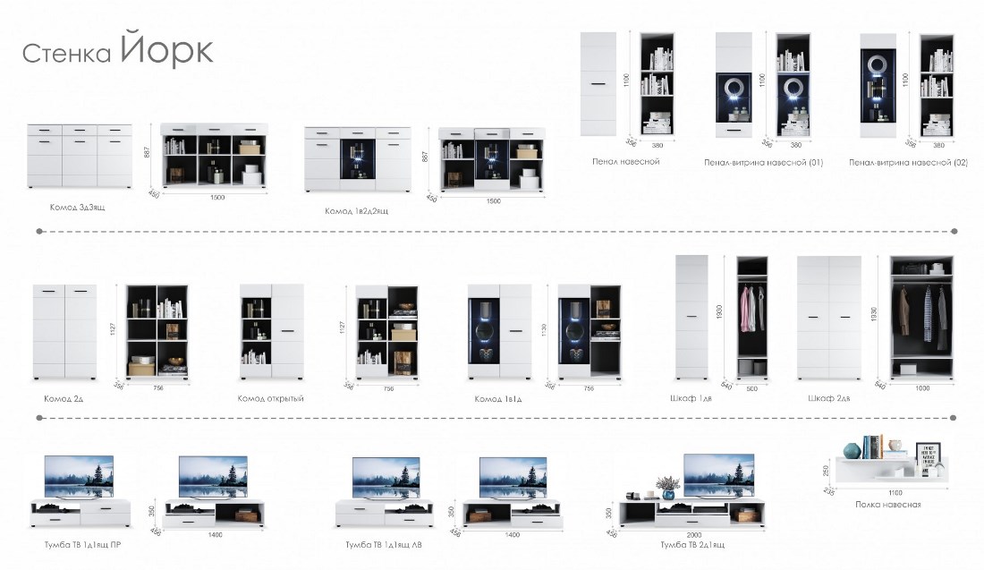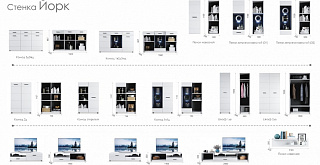 Коллекция Йорк выполнена в стиле минимализма. Строгие, лаконичные линии подчеркивают элегантность комплекта. Белый цвет мебели с деталями глубокого черного визуально сделает комнату светлее, просторнее и позволит составить безупречный по стилю комплект мебели. Сочетание глянцевой и стеклянной поверхностей, открытых полок создадут уютную обстановку и позволят украсить убранство комнаты приятными мелочами и разместить любимые книги и фото.