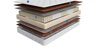Материал: Кокосовая койра, Пенополиуретан, Блок независимых пружин, Чехол, Войлок, Трикотаж