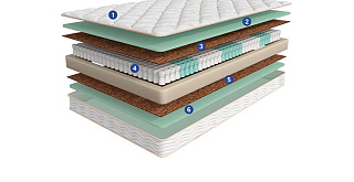 Материал: Кокосовая койра, Пенополиуретан, Блок независимых пружин, Чехол, Войлок, Трикотаж