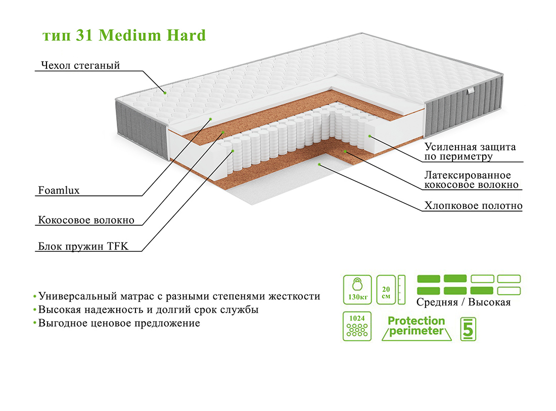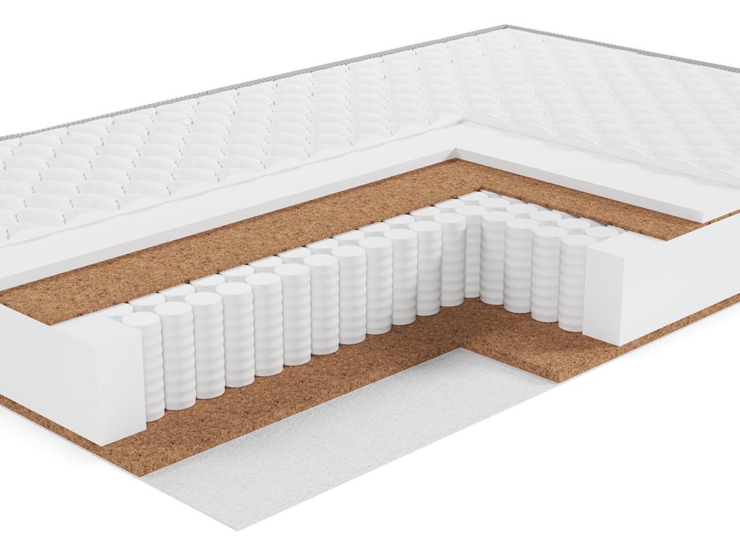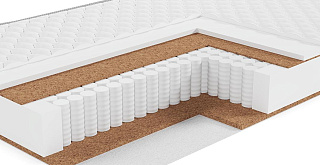 Материал: Блок независимых пружин, Хлопковое полотно, Чехол, FoamLux, Кокосовое волокно, Латексированная кокосовая плита, Усиление по периметру матраса