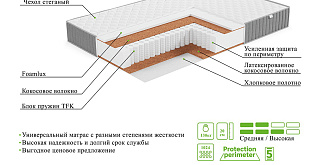 | Материал | Блок независимых пружин, Хлопковое полотно, Чехол, FoamLux, Кокосовое волокно, Латексированная кокосовая плита, Усиление по периметру матраса |