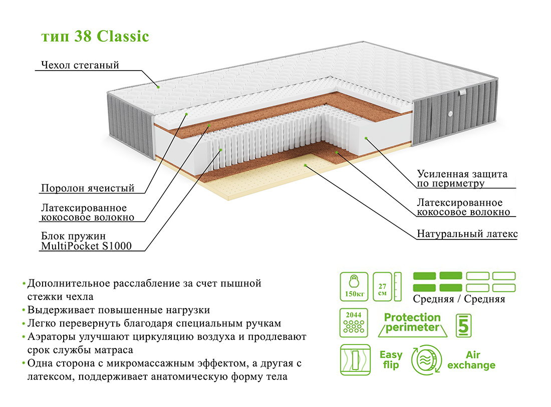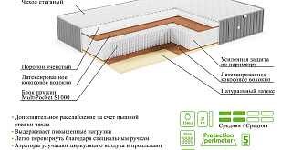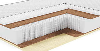 Материал: Латекс, Блок независимых пружин, Латексированная кокосовая плита, Усиление по периметру матраса