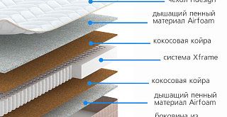 Доступная модель матраса с универсальной средней жесткостью сторон на основе AirFoam, кокосовой койры и блока независимых пружин.