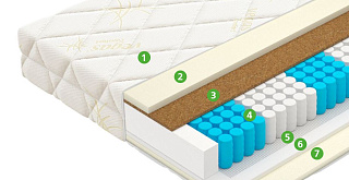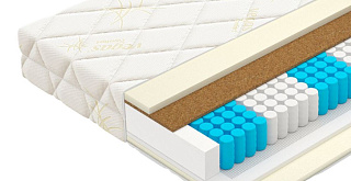 | Материал | Кокосовая койра, Блок независимых пружин, Vegaflex, Memoryfoam, Чехол, Мебельная сетка |