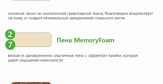 | MemoryFoam | Современный материал с памятью формы, используемый в космической промышленности. Обладает одновременно вязкостью и эластичностью, обеспечивая ощущение невесомости |