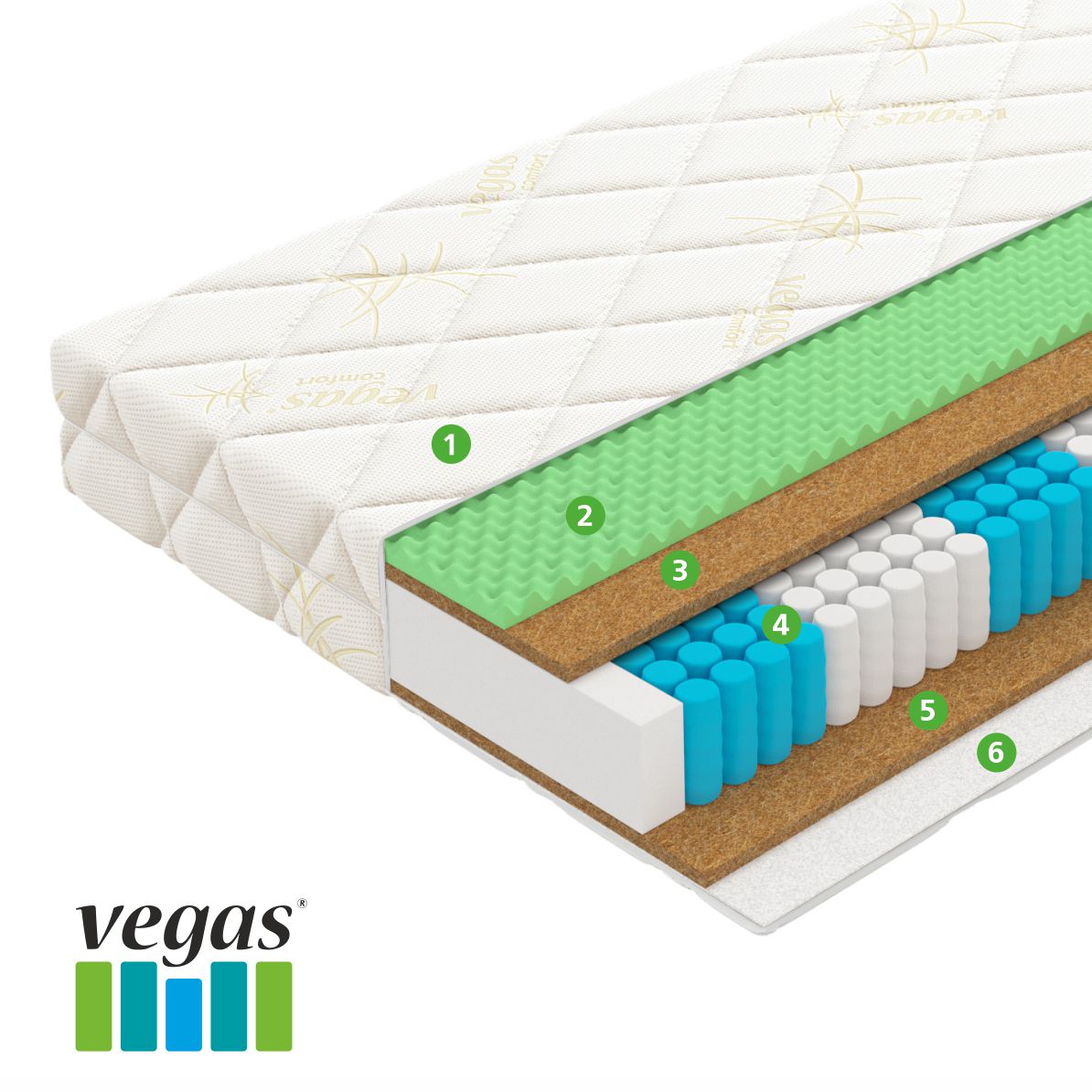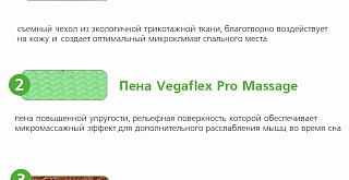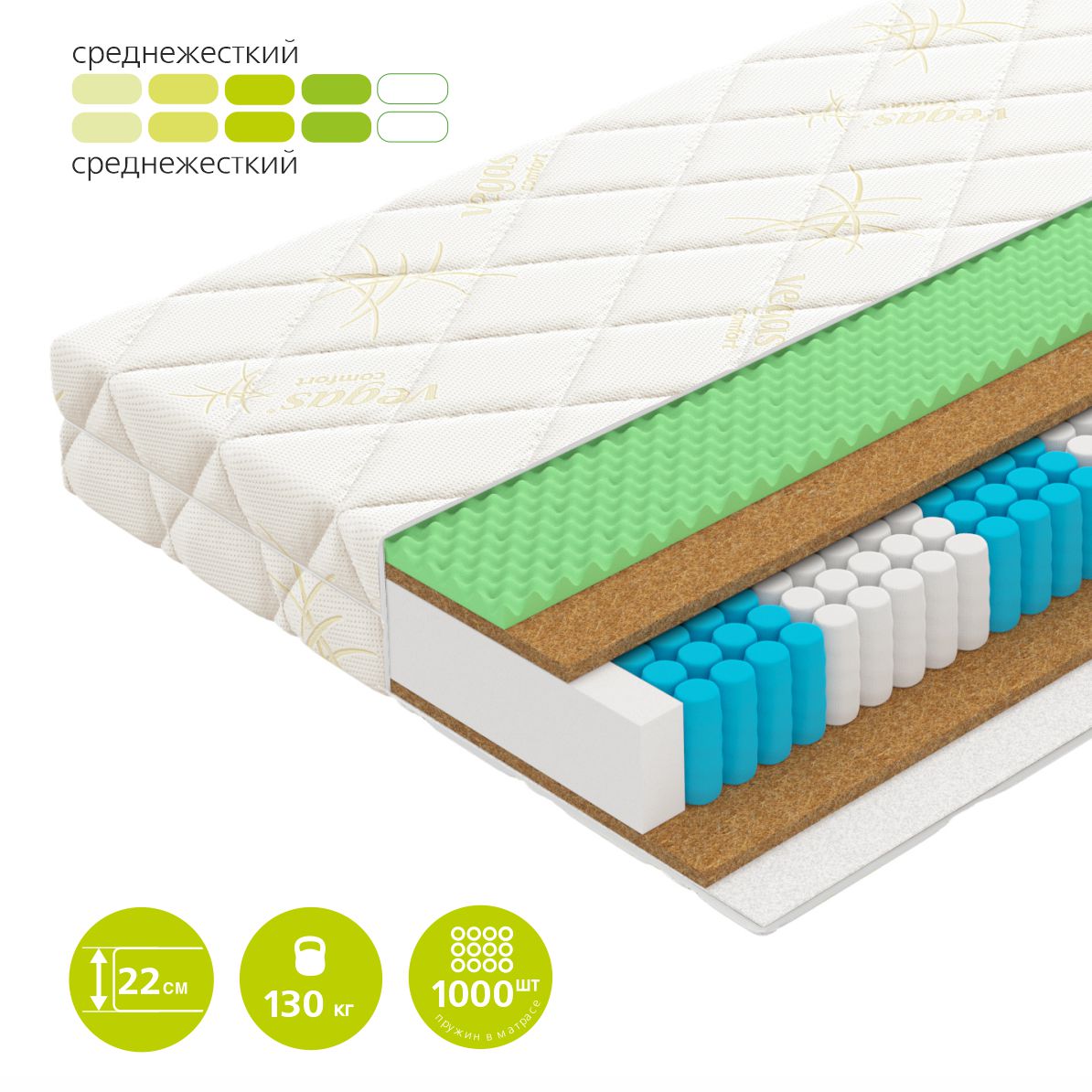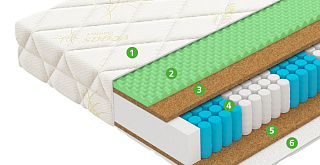 | Материал | Кокосовая койра, Блок независимых пружин, Vegaflex, Чехол, Мебельная сетка |