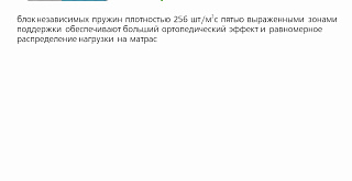 | Smartpocket PRO 5-Zone | Усовершенствованный блок независимых пружин Smartpocket плотностью размещения 256 пружин на м2. Каждая пружинка упакована в отдельный чехол и работает самостоятельно, отдельно, независимо от других пружин в блоке. Такой блок принимает форму тела спящего на матрасе - в этом и заключается ортопедический эффект. Усиление ортопедического эффекта происходит благодаря пяти выраженным зонам поддержки, которые равномерно распределяют нагрузку на матрас для более комфортного и здорового сна. |