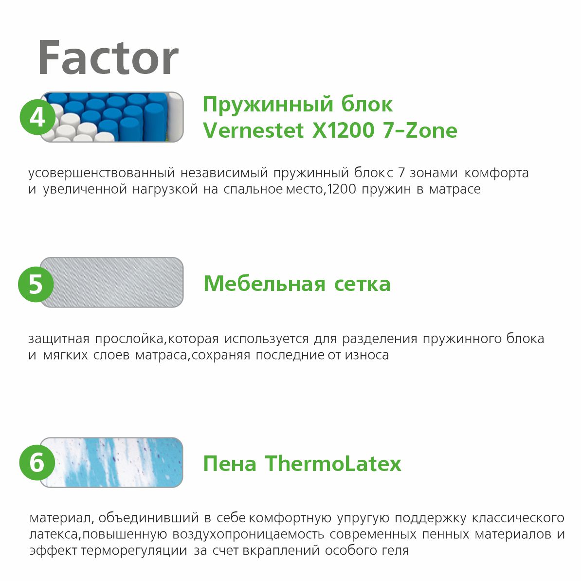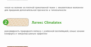 | Climalatex | Разновидность латекса с усиленной перфорацией и повышенной вентиляцией. Имеет рельефную форму с семью зонами комфорта и микромассажным воздействием. Надежно подстраивается под контуры тела, обеспечивая расслабление. |