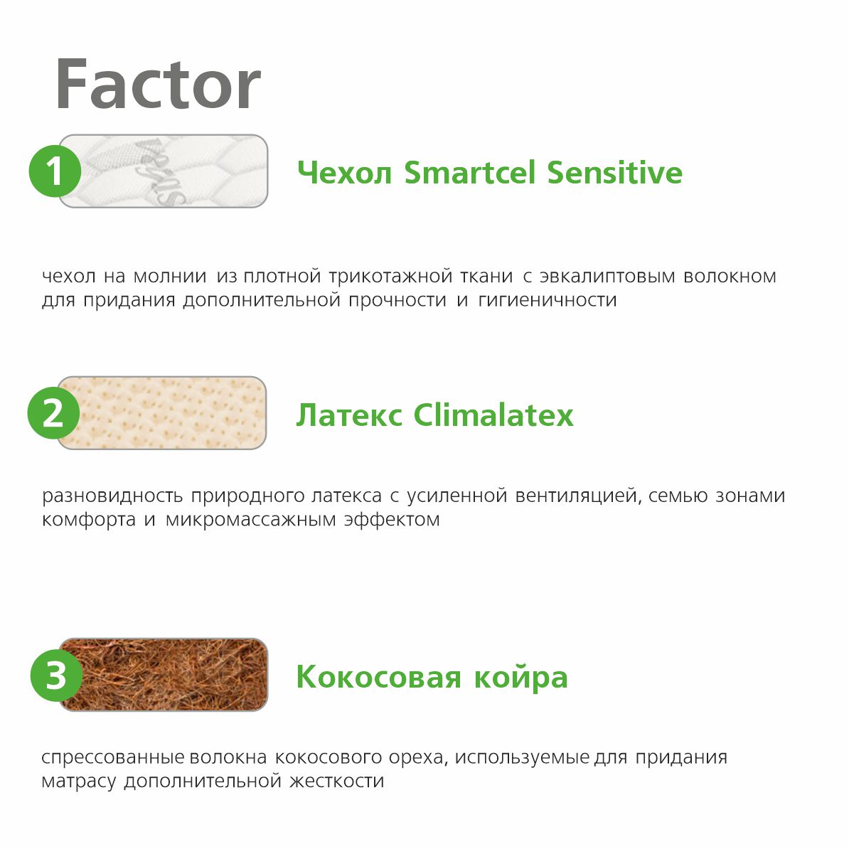 | Материал | Кокосовая койра, Латекс, Чехол, Climalatex, Мебельная сетка |