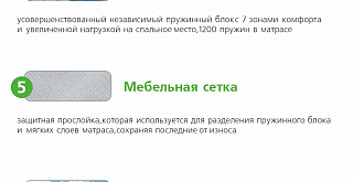| Medizone R2200 | Блок независимых пружин из закаленной стали с выраженными зонами. Сбалансированное распределение зон по длине матраса наиболее эффективно учитывает анатомию тела человека. Уникальная центральная зона обеспечивает поддержку людей разного роста. Диаметр пружины 40 мм. Высота пружинного блока 140 мм. |