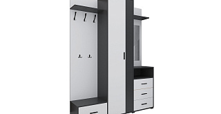 Полноценная прихожая, в которую входит шкаф с выдвижной вешалкой, 4 шуфляды полного выдвижения, зона с крючками для одежды, зеркало, открытые антресоли.