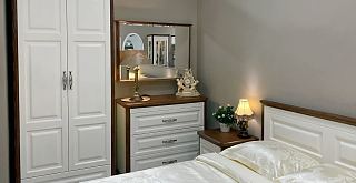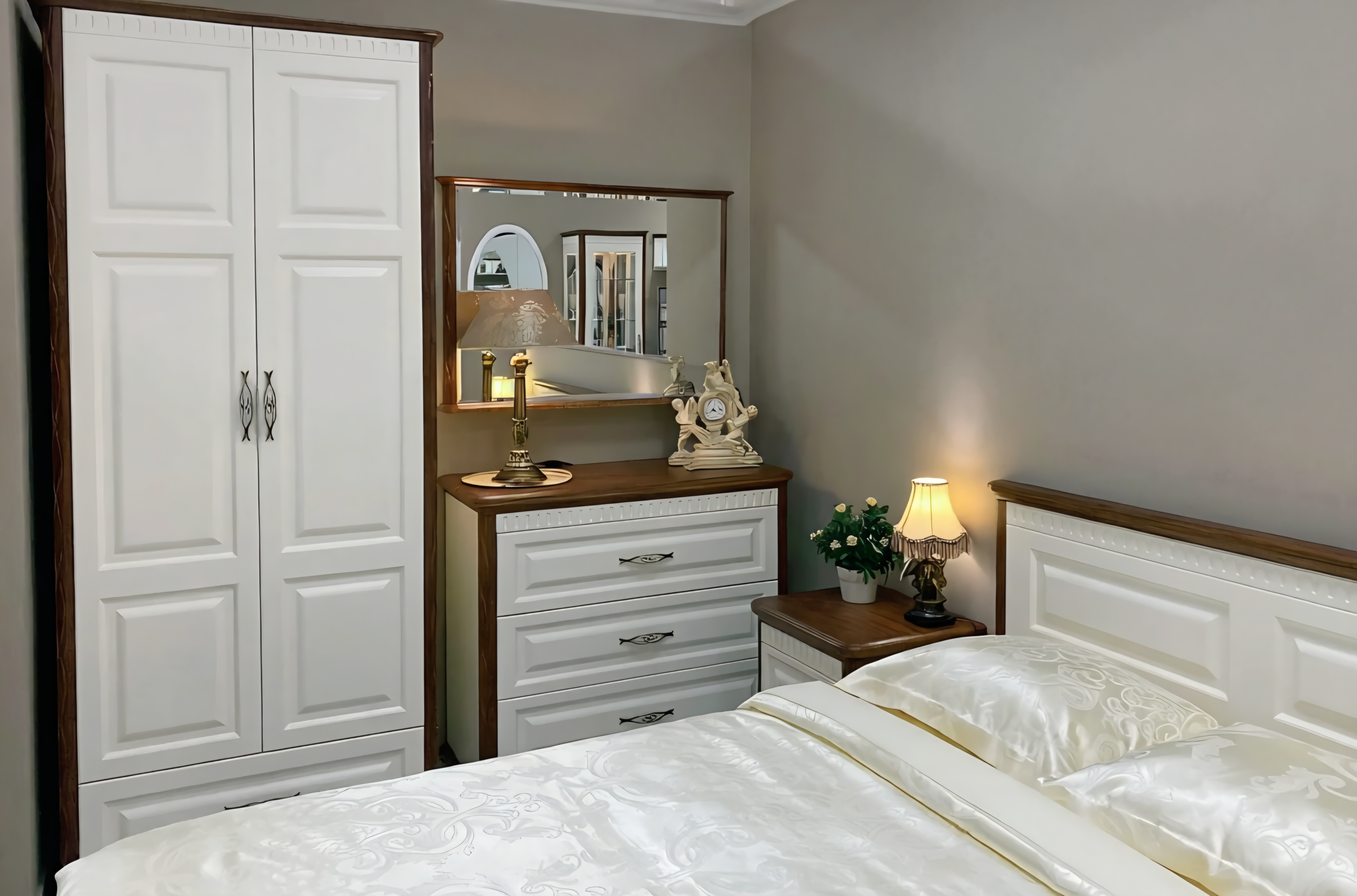 Коллекция Марсель сочетает древесную структуру дуба кантри и нежный кремовый оттенок. Лаконичный дизайн подчёркивает современный стиль, а вместительные шкафы с системой плавного закрывания и ящики с направляющими Quadro Hettich обеспечивают удобство и долговечность. Дополнительный модуль‑ящик для кровати увеличивает пространство для хранения, а витрины с фацетом добавляют визуальный акцент.